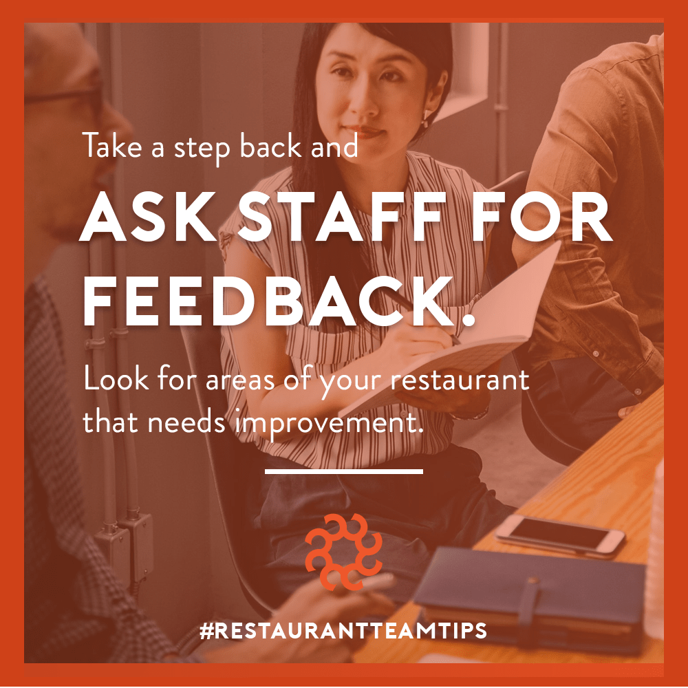 - Try hosting a variety of meetings with your staff to open multiple feedback channels such as engaging in one-on-one meetings, group meetings, or offering an anonymous feedback box to see what areas of your restaurant needs or what you need to improve upon.